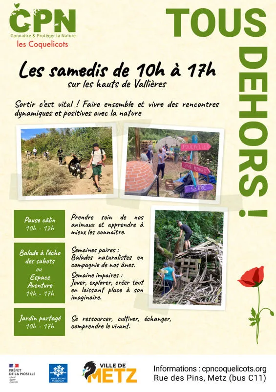 "Espace Aventure" (semaines impaires) : les enfants vont pouvoir retrouver notre Espace Aventure ! Un lieu de liberté, de créativité et d'exploration où l'on peut construire des cabanes, grimper, jouer, inventer des histoires… et se salir un peu les mains.Pensé comme un espace de jeu libre et naturel, l'Espace Aventure permet aux plus jeunes de développer leur imagination, leur autonomie et leur lien à la nature, le tout en toute sécurité grâce à la présence bienveillante de nos animateurs. Entrée libre, gratuite et sans inscription. Les plus petits sont les bienvenus accompagnés d'un adulte.