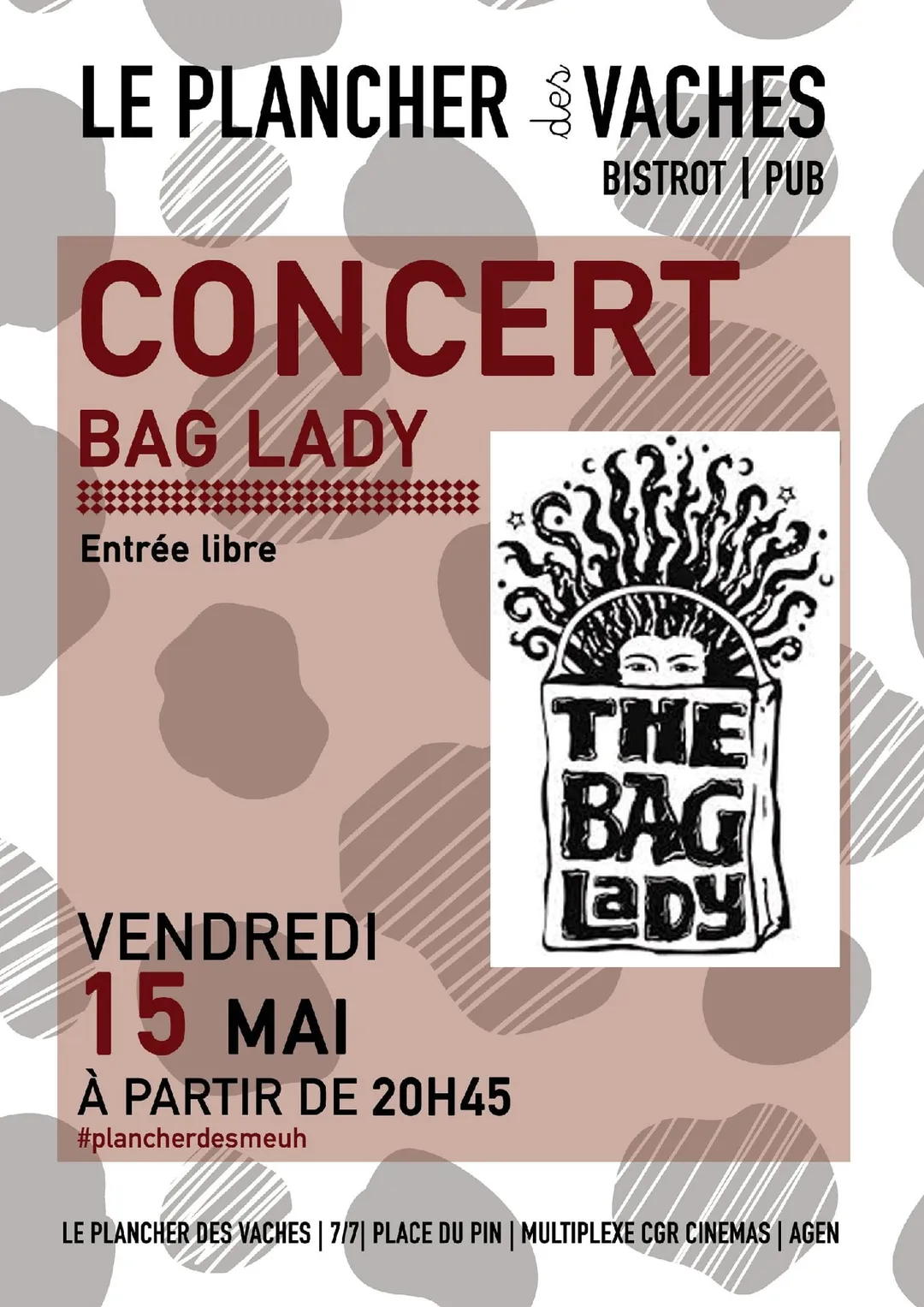 Concert live avec Bag Lady au Plancher des Vaches. Une soirée musicale pleine d’énergie et d’émotions dans une ambiance conviviale. Venez profiter du live entre amis autour d’un verre ou d’un bon plat, et laissez-vous porter par la musique !