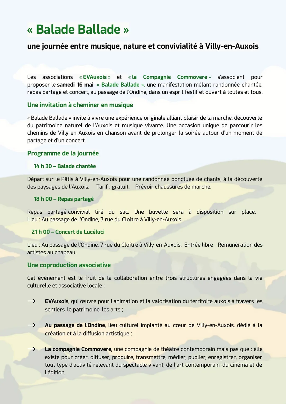 Les associations « EVAuxois » et « la Compagnie Commovere » s'associent pour proposer « Balade Ballade », une manifestation mêlant randonnée chantée, repas partagé et concert, au passage de l'Ondine, dans un esprit festif et ouvert à toutes et tous.