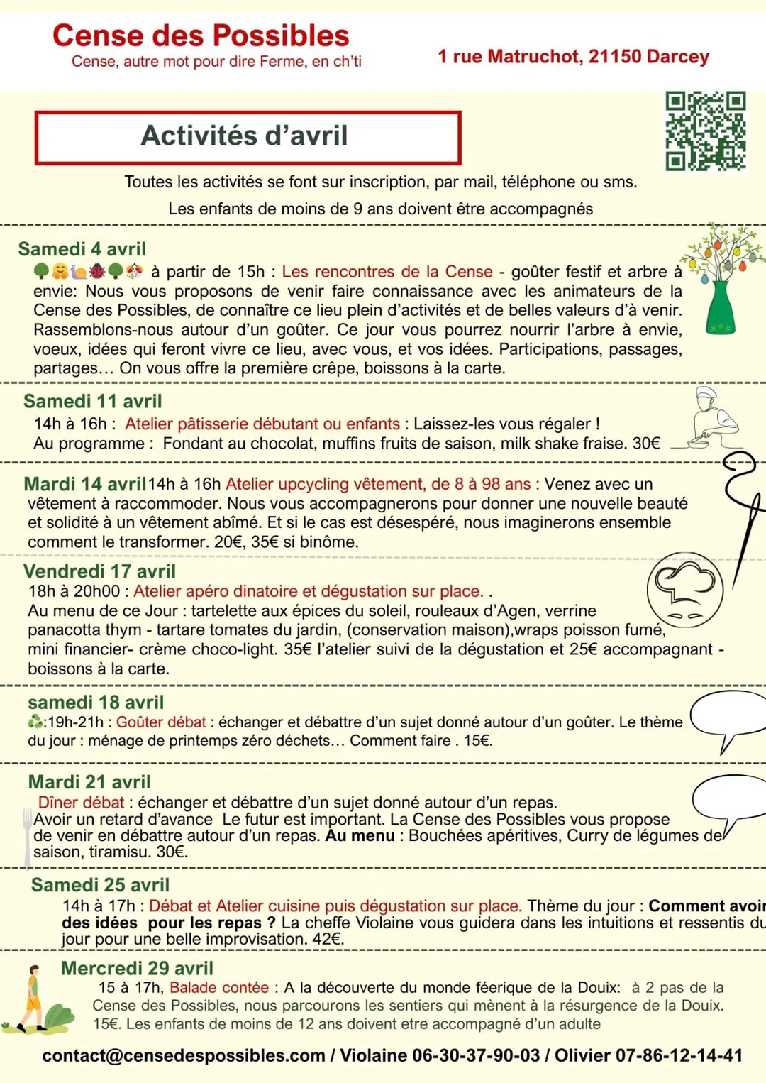 Violaine et Olivier sont récemment arrivés en Bourgogne et souhaitent y vivre en pleine conscience des enjeux environnementaux. Pour cela ils ont créé Cense des Possibles dans une ancienne ferme au cœur du village de Darcey. C’est maintenant un lieu charmant et gourmand dans lequel ils vous proposent de participer à des activités éco responsables dans le cadre d’ateliers participatifs. Une excellente manière de se former, de développer des apprentissages et d’avancer ensemble sur le chemin d’une consommation plus frugale, plus locale et respectueuse de notre environnement naturel et humain.