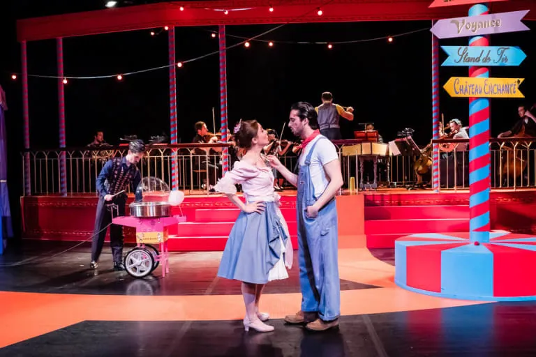 Dans la mise en scène de Mirabelle Ordinaire, l’action est transposée dans une fête foraine contemporaine : Bastien devient mécanicien de stands, des visiteurs tirent sur des loups en carton, et les musiciens jouent dans un kiosque. Présentée en version française, cette adaptation colorée et festive rend l’œuvre claire et accessible à tous les publics, tout en restant fidèle à l’esprit de Mozart.