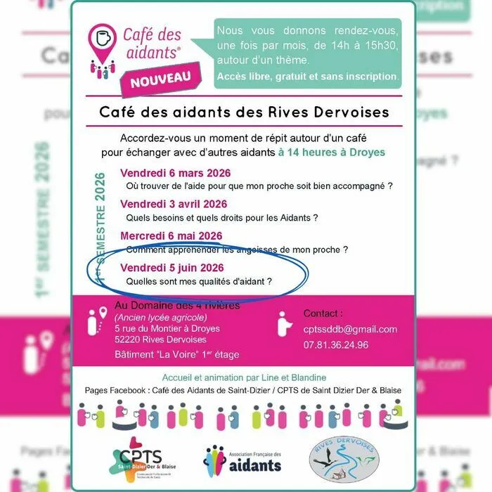 **Le Café des Aidants© – antenne des Rives Dervoises** est un espace de parole et de soutien destiné aux personnes qui accompagnent un proche malade, en situation de handicap ou en perte d’autonomie.
