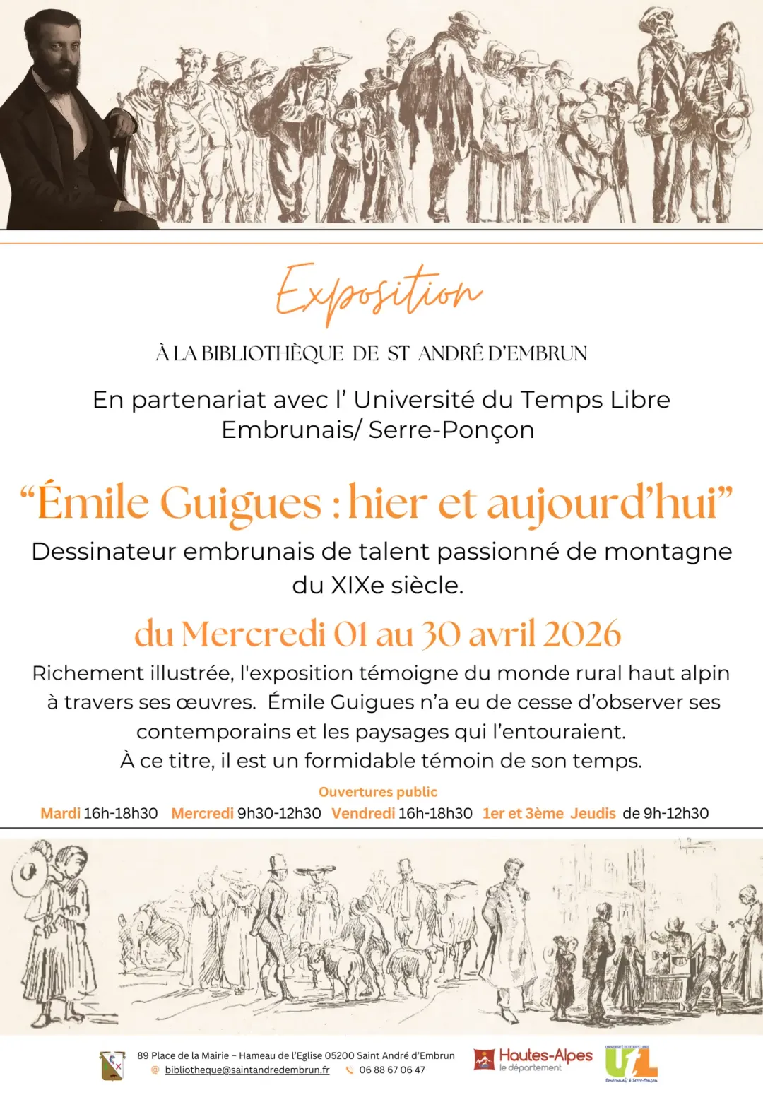 En partenariat avec l’ Université du Temps Libre Embrunais/ Serre-Ponçon, la bibliothèque de Saint André d'Embrun vous propose une exposition richement illustrée. Émile Guigues témoigne du monde rural haut alpin à travers ses œuvres. Il n’a eu de cesse d’observer ses contemporains et les paysages qui l’entouraient. À ce titre, il est un formidable témoin de son temps.