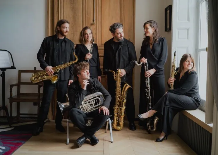 L’intimité de la musique de chambre, la puissance d’un petit orchestreSextuor unique en son genre, Saxback est un cocktail d’instruments à vents (presque) tous nés du génie inventif d’Adolphe Sax – saxophones, saxhorn et clarinettes. Cet ensemble atypique de bois et de cuivre interprète aussi bien des transcriptions de Bach, Prokofiev, Debussy ou Bernstein que des œuvres composées sur mesures, faisant appel à des compositeurs comme A. Markeas, T. Probst, N. Gouin, E. Goubert, M. Stefanel li, et bien d’autres. Diplômés des Conservatoires de Paris, de Lyon et d’Amsterdam, les six musiciennes et musiciens de Saxback sont unis par une grande connivence et un plaisir de jouer qui font de leurs concerts un feu d’artifice de musicalité, d’énergie et d’émotion. Créé en 2016, Saxback a remporté en 2018 le deuxième prix du Concours international de musique de chambre « M-Prize » aux États-Unis. L’ensemble se produit dans de nombreux festivals à travers la France — à La Folle Journée de Nantes, au Festival International de Musique de Besançon et bientôt aux Flâneries de Reims et collabore régulièrement avec l’association Les Concerts de Poche — et à l’international, récemment en Belgique et bientôt en Turquie au Festival International de Musique de Chambre d’Istanbul. Le groupe entretient une forte relation avec la Corée du Sud qui les accueilli en 2019, en 2024 et qui les accueillera à nouveau fin 2025 pour une tournée à travers tout le paysLe répertoire du sextuor s’articule en programmes modulables : Retour (Dessner, Bach, Scarlatti, Goubert, Berlioz), Tragic Love (Prokofiev, Debussy, Poulenc, Sibelius), et l’ambitieux Lumière Noire. Saxback collabore également avec le pianiste N. Gouin dans un programme en septuor autour de la Totentanz de Liszt et de Khoros, composé par le pianiste et créé à La Folle Journée de Nantes 2025Les artistes :Louise Marcillat – clarinettes Mib&SibMathilde Salvi – saxophonesPaul Lamarque – saxophonesTom Caudelle – SaxhornAntonin Pomme – saxophonesCécilia Lemaitre-Sgard – clarinettes