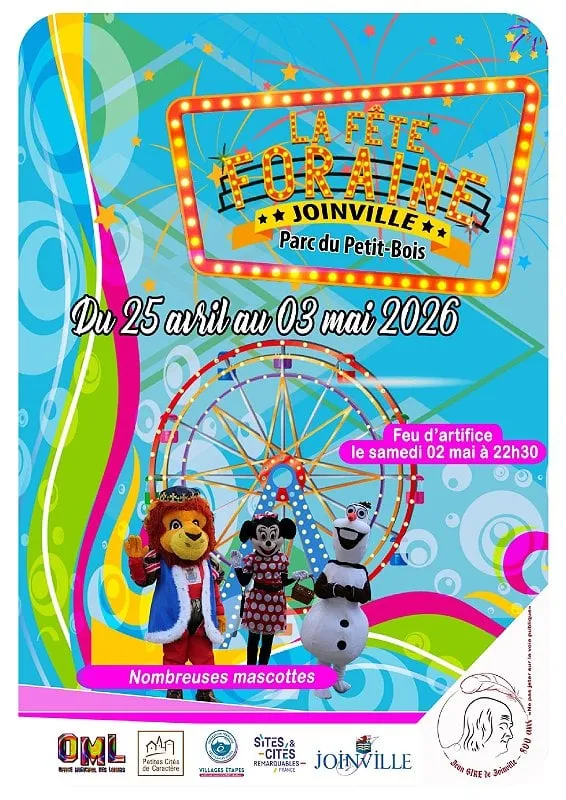 Venez vous amusez entre amis ou famille à la fête foraine de Joinville. En plus, il y aura un feu d'artifice le samedi 02 mai à 22h30 ! Soyez au rendez-vous au parc du petit bois (face au Château du...