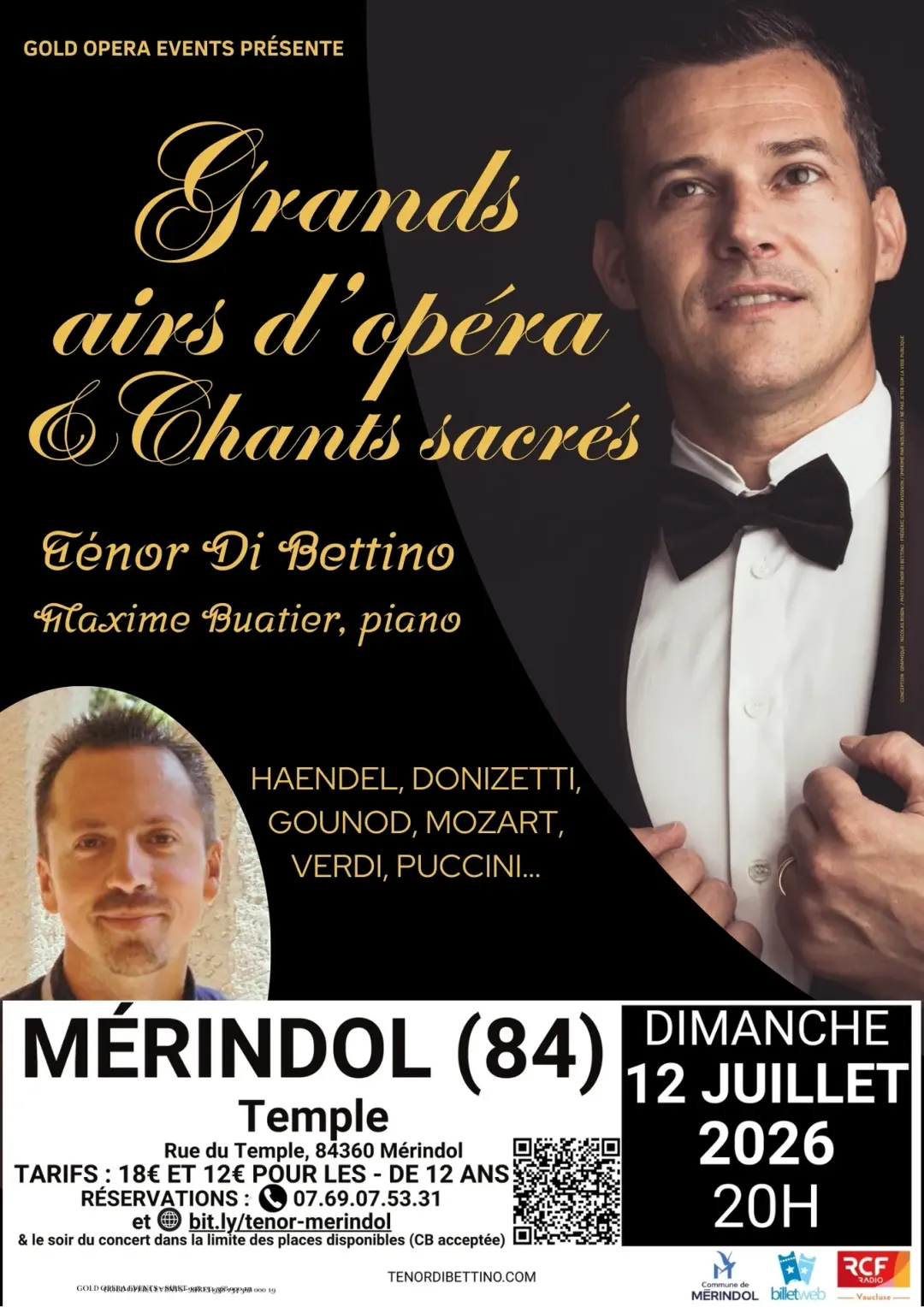 Le Ténor Di Bettino et son pianiste Maxime Buatier vous donnent rendez-vous à Mérindol (Temple de Mérindol) pour « Grands Airs d'Opéra et Chants Sacrés », le dimanche 12 juillet 2026 à 20h.