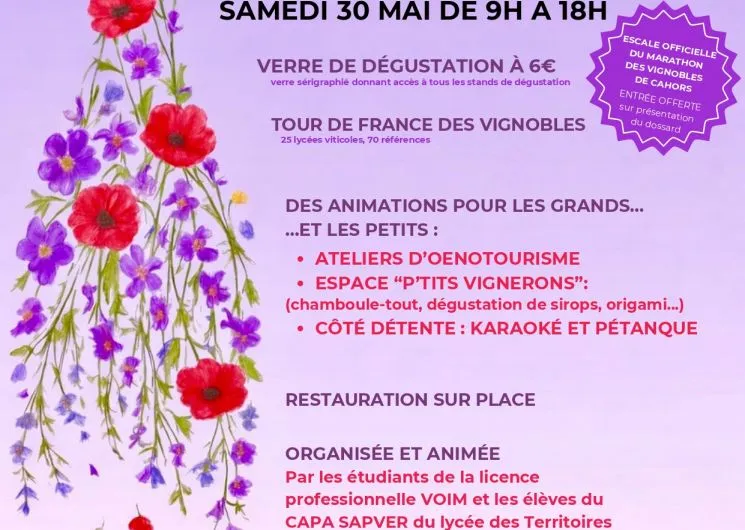 Dans le cadre du week-end du Marathon des Vignobles de Cahors, le Lycée des Territoires – Domaine de Lacoste vous invite à sa traditionnelle Fête des Vins.Véritable vitrine du savoir-faire de l'enseignement agricole, cet événement réunit cette année les productions de 25 lycées viticoles français. Les étudiants en Licence Professionnelle VOIM et les élèves de CAPA SAPVER accompagneront les visiteurs pour une découverte pédagogique et sensorielle de 70 cuvées issues de tous nos terroirs.Un rendez