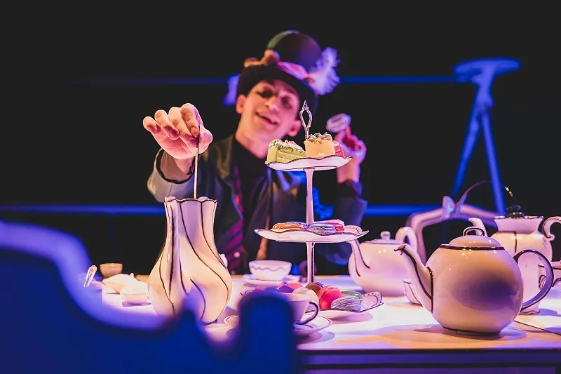 Résumé : une plongée poétique dans le pays des merveilles. Sur un fil tendu, le Chapelier Fou avance entre rêve, folie et réalité. Autour de lui, le Lièvre de Mars, le Loir, des marionnettes animées, et une mystérieuse Alice qui change de forme à chaque apparition. Le tout, rythmé par une musique jouée en direct. Ce spectacle librement inspiré du conte de Lewis Carroll réinvente la célèbre scène du thé dans un univers visuel monochrome et décalé. Un voyage loufoque et sensible où le temps semble suspendu. Un bijou d'inventivité, à vivre dès l'enfance.