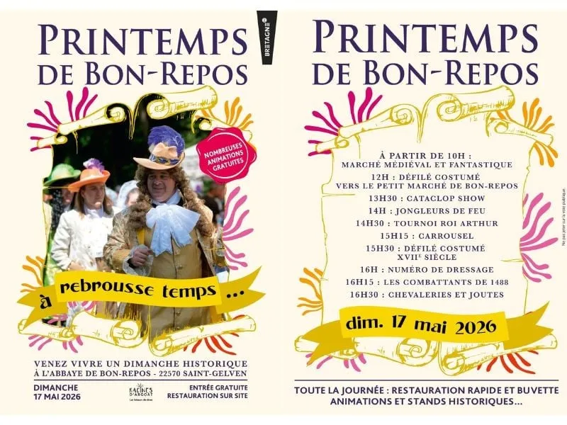 Cette manifestation lance la saison des animations et fêtes historiques en Centre-Bretagne.Entre démonstrations de combats, jonglage, échassiers, campement médiéval, initiation à l’archerie, et joutes équestres ; venez remonter le temps sur le domaine de Bon-Repos !