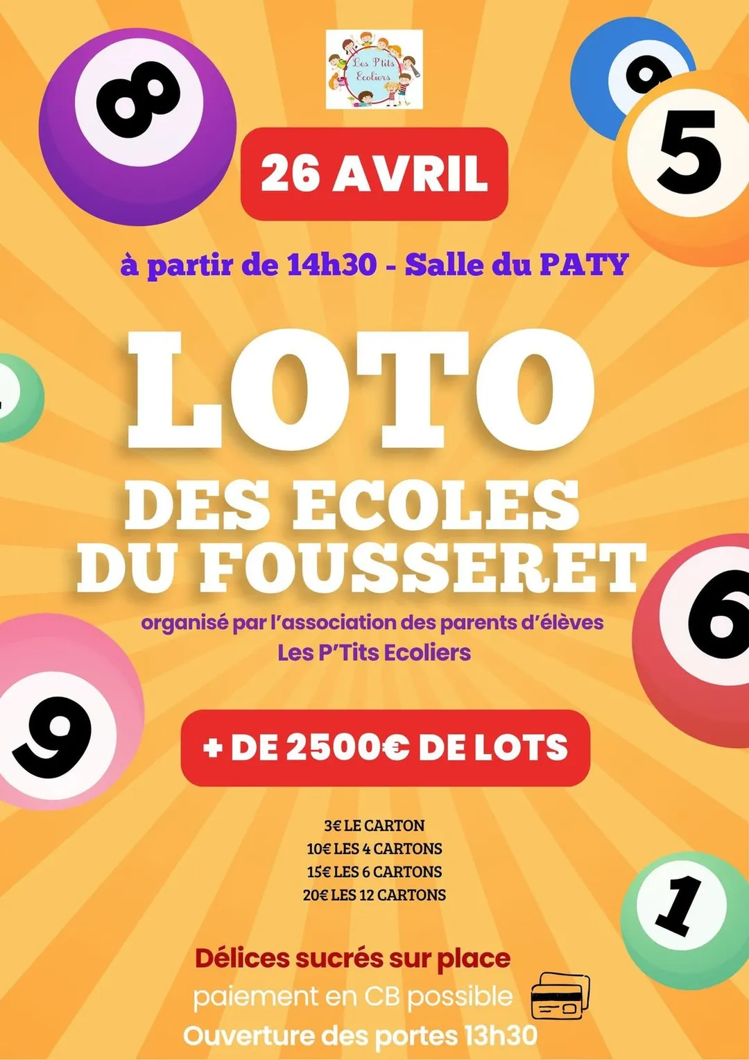Venez nombreux à notre Loto pour la première, de nombreux lots à gagner.
