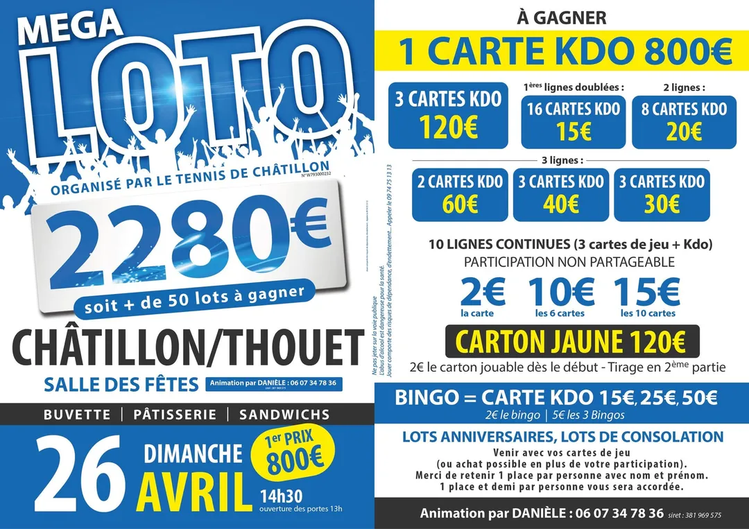 Mega loto animé par Danièle et organisé par le Tennis club de Chatillon sur Thouet le dimanche 26 avril 2026.