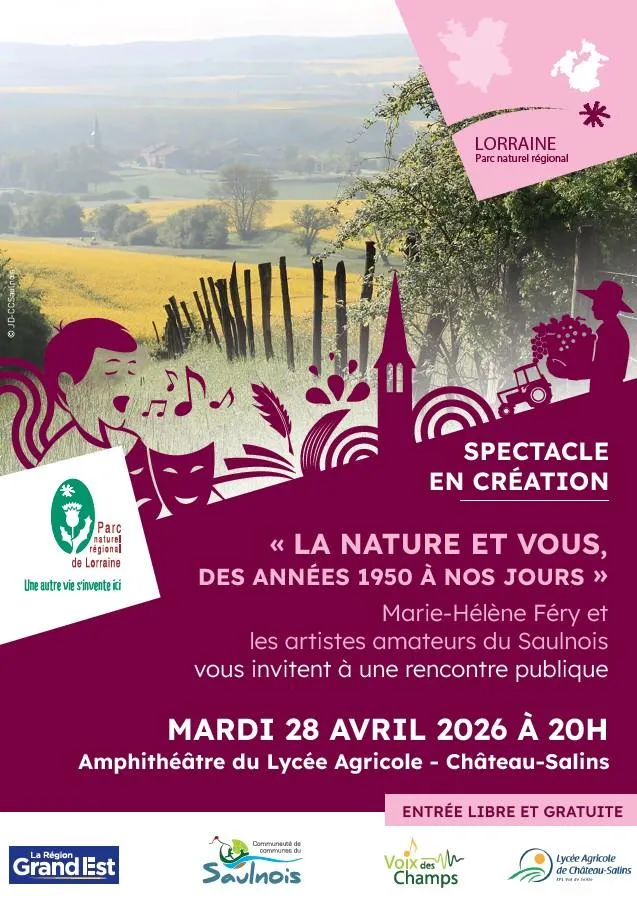 Depuis plusieurs mois, le Parc naturel régional de Lorraine a missionné l'artiste professionnelle Marie-Hélène Féry pour accompagner des artistes amateurs du Saulnois dans la création d'un spectacle. Chansons, lecture de textes, sketchs...autour de notre relation à la nature composeront le spectacle qui sera diffusé en juin prochain.
