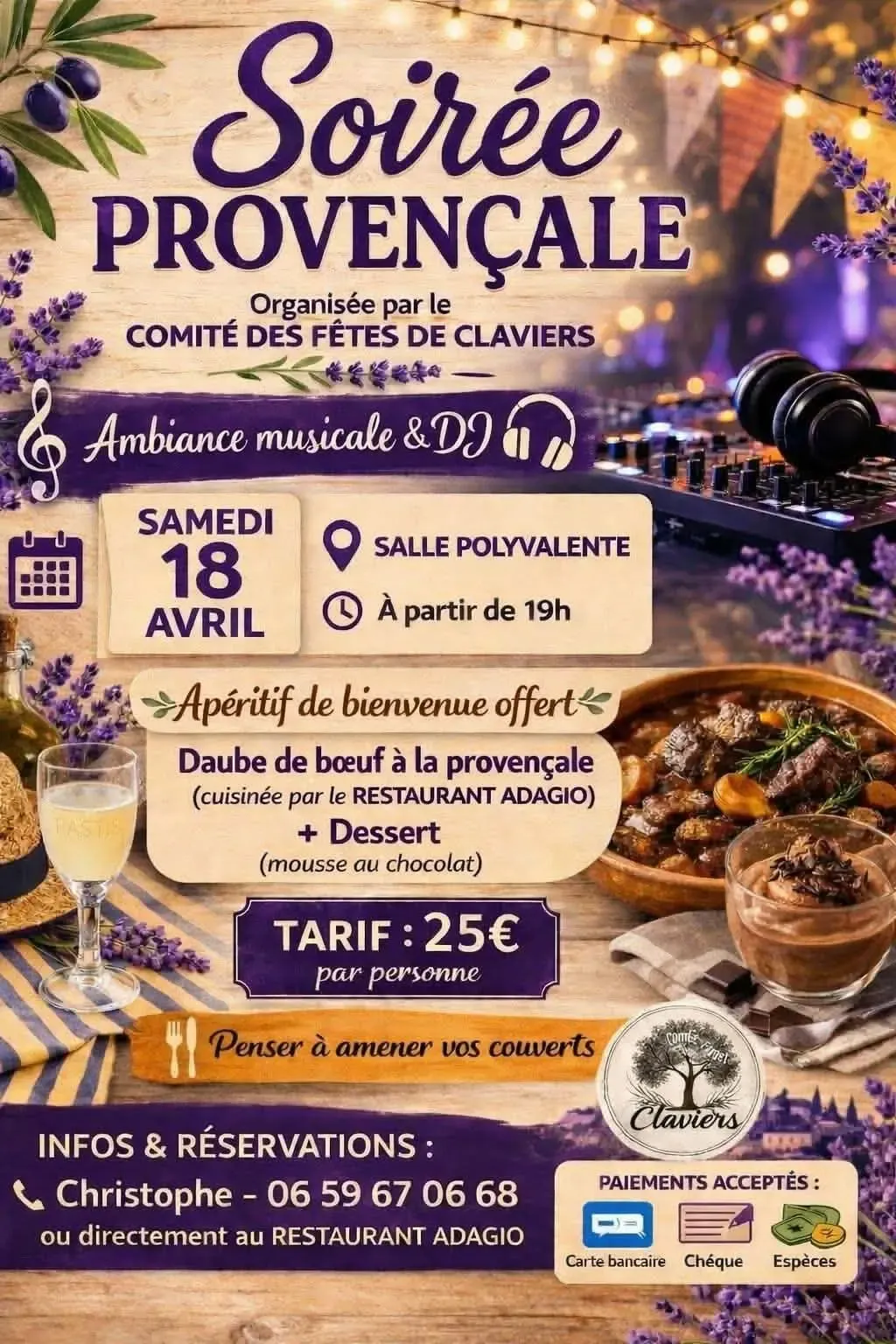 Le Comité des Fêtes vous propose un menu provençal avec ambiance musicale. Daube de boeuf cuisinée par les restaurant Adagio.