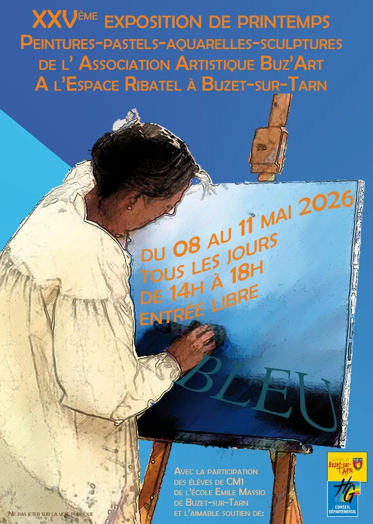 L’Association Artistique Buz’Art organise sa 25ème exposition de printemps qui se tiendra du vendredi 8 mai au lundi 11 mai inclus. L’exposition sera ouverte au public de manière libre et gratuite les après-midi de 14h à 18h à l’Espace Ribatel à Buzet-sur-Tarn (700, route de Bessières). Cette exposition présentera les travaux réalisés par les membres de l’association, mais aussi ceux d’artistes extérieurs à l’association qui souhaitent exposer avec nous. En plus des travaux réguliers, 2 thèmes seront mis à l’honneur cette année: « le bleu » et « le clair obscur ». Une place sera réservée au travail des élèves de CM1 de l’école Emile Massio de Buzet sur Tarn qui nous accompagnent chaque année. Le vernissage aura lieu le vendredi 8 mai à partir de 18h. L’exposition sera ouverte au public les 4 jours de 14h à 18h. Pour celles et ceux qui souhaitent exposer avec nous, le règlement-inscription est disponible auprès du secrétariat de l’association à l’adresse: association.buzart@gmail.com Un Prix du Public sera remis en fin d’exposition à l’artiste qui aura récolté le plus de votes du public. Nous vous attendons nombreux pour venir profiter de cette belle exposition!